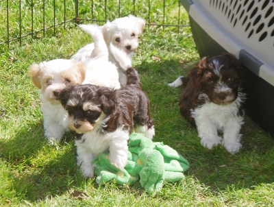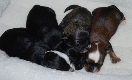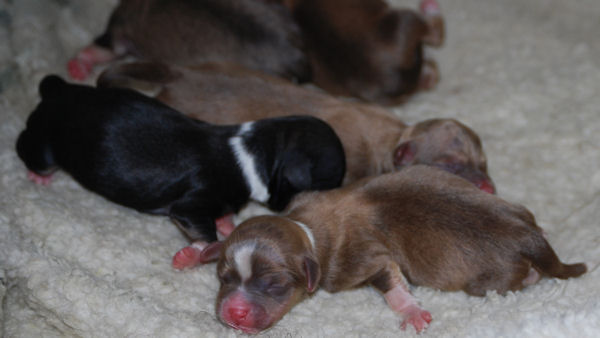 Three chocolate males, one brown sable male and one black and white female.