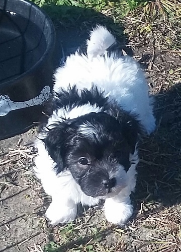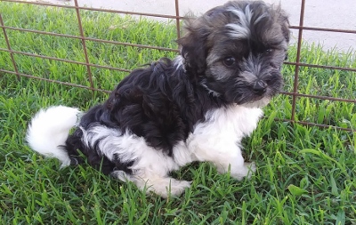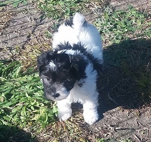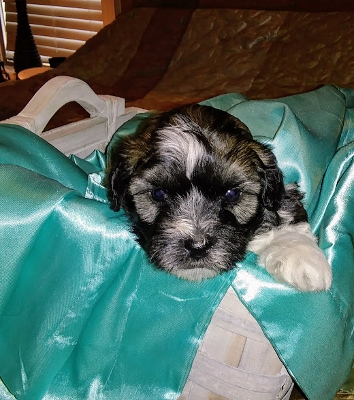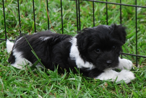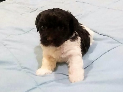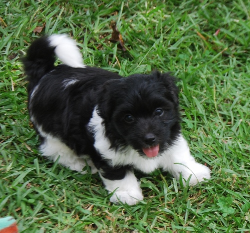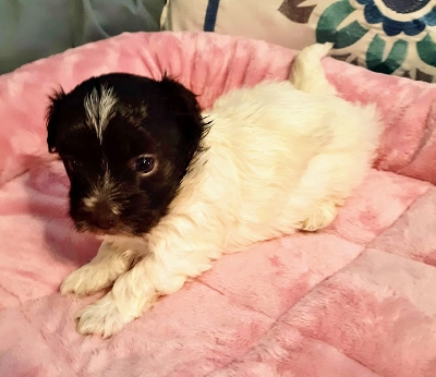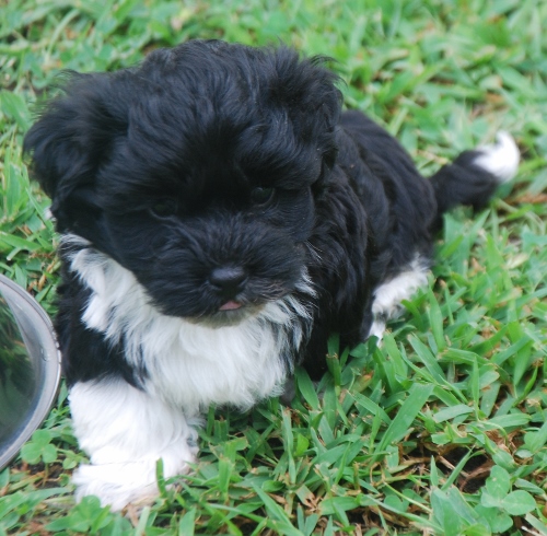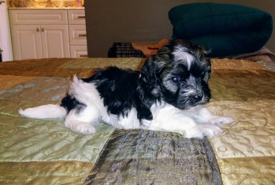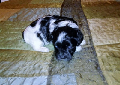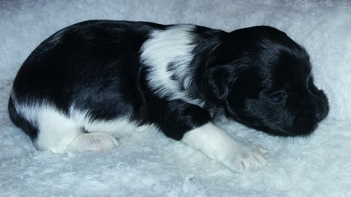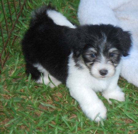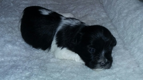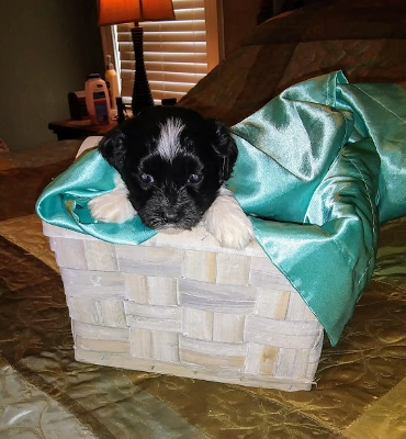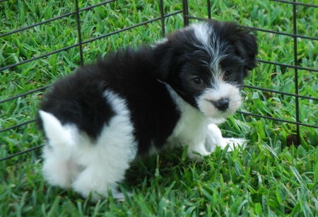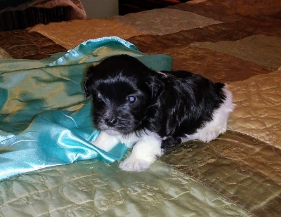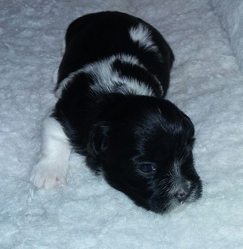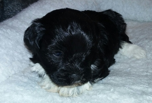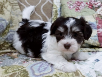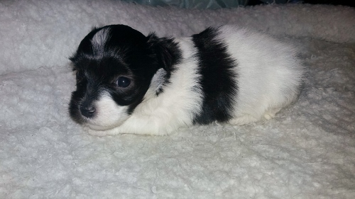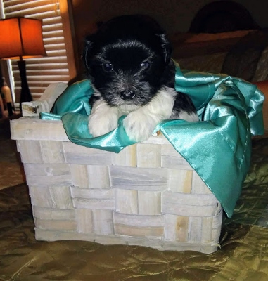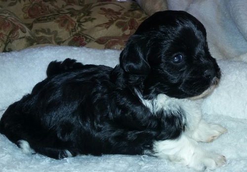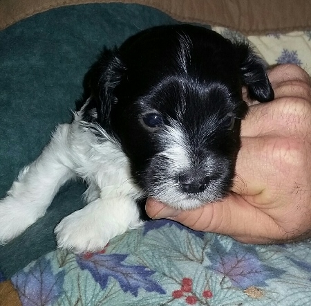 Adorable black and white male Havanese puppy. The Daddy is my AKC Champion, Tux.