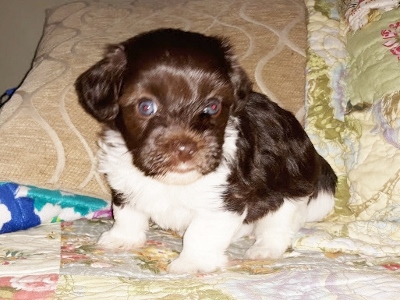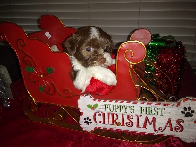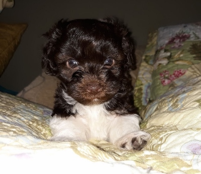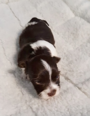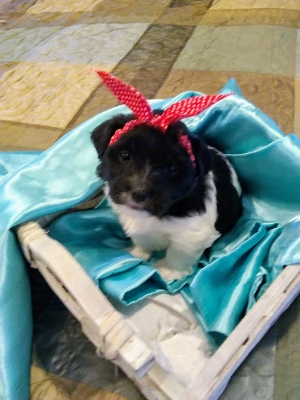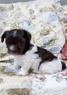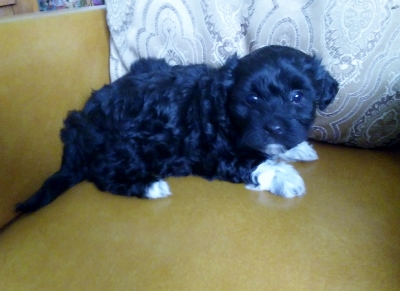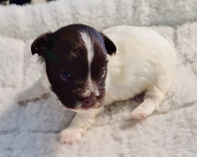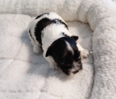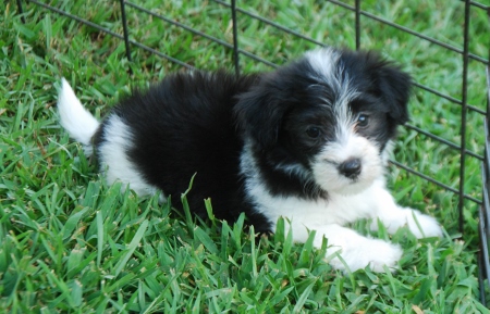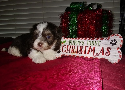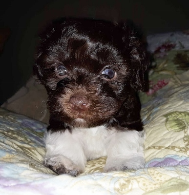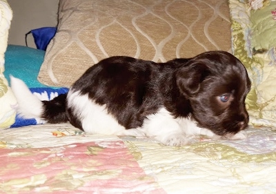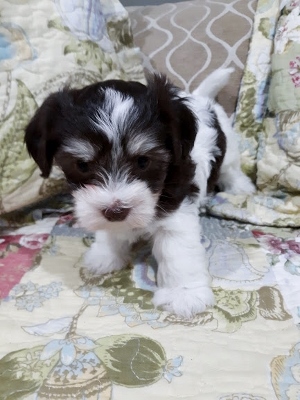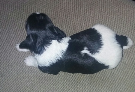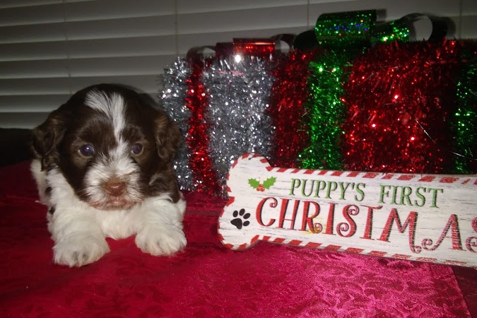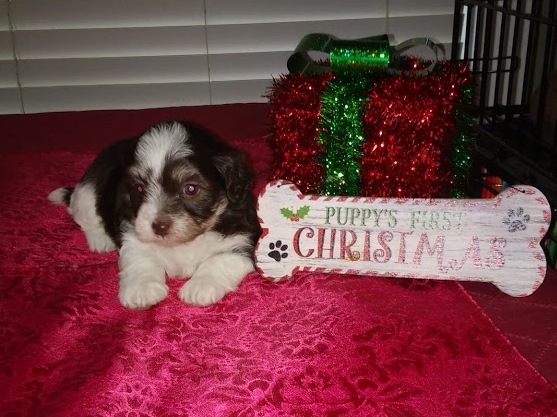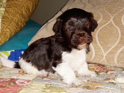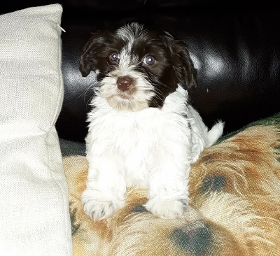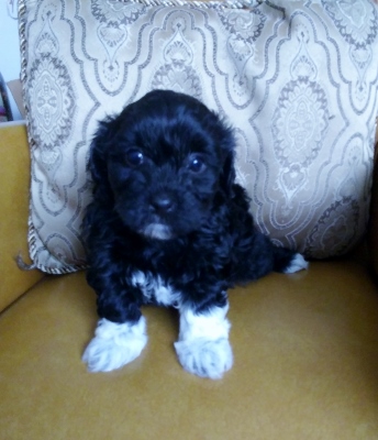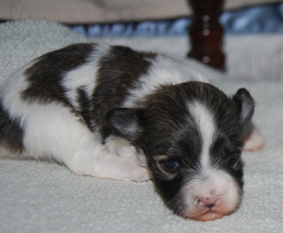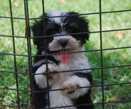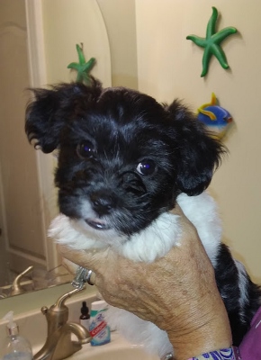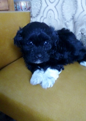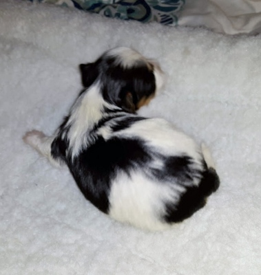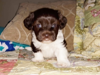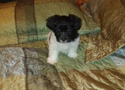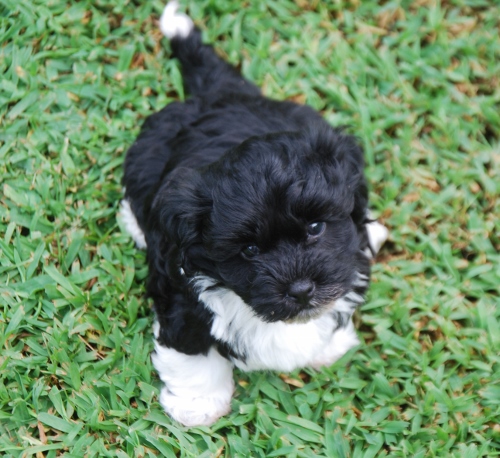 Adorable black and white male Havanese puppy. The Daddy is my AKC Champion, Tux.